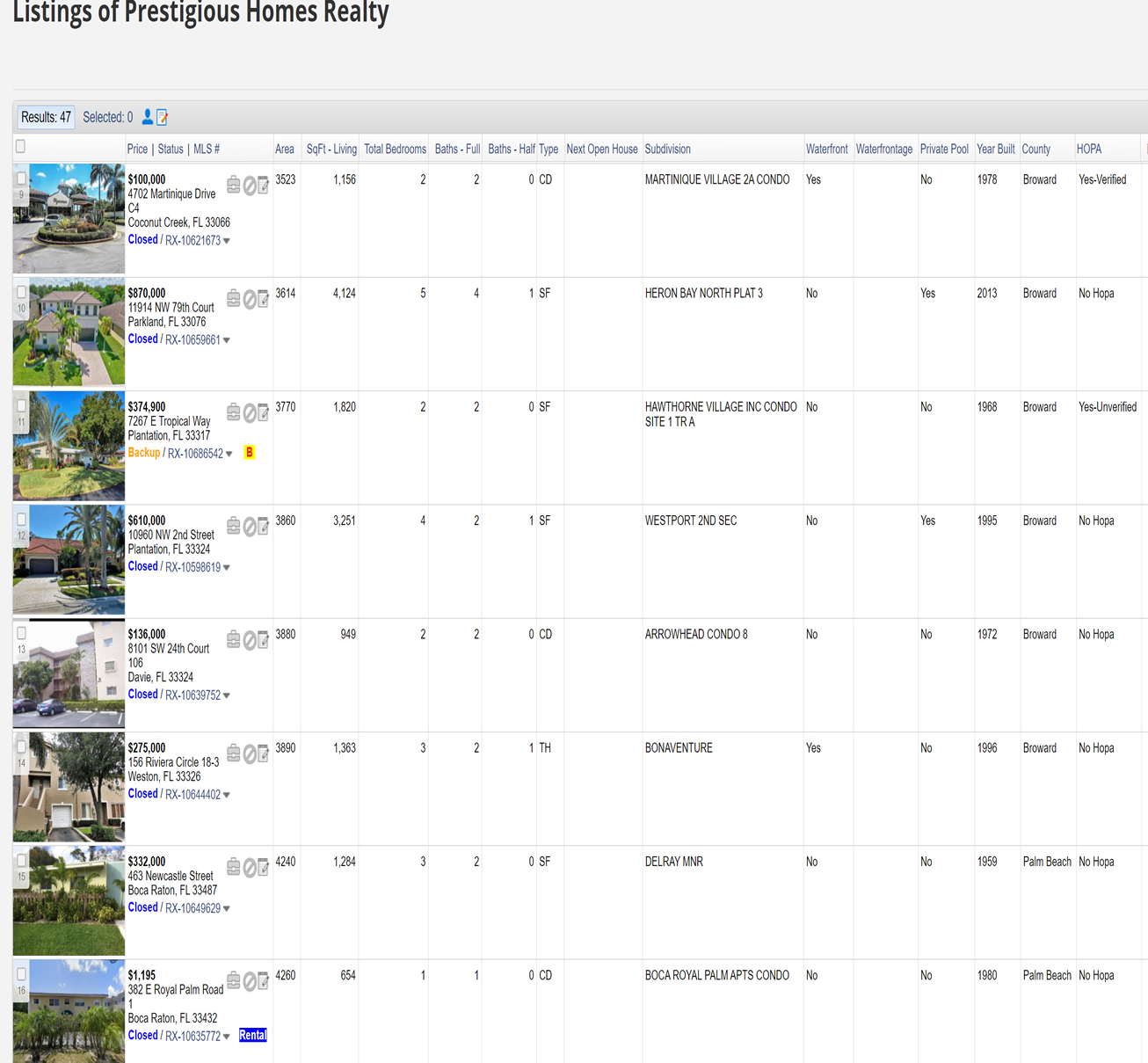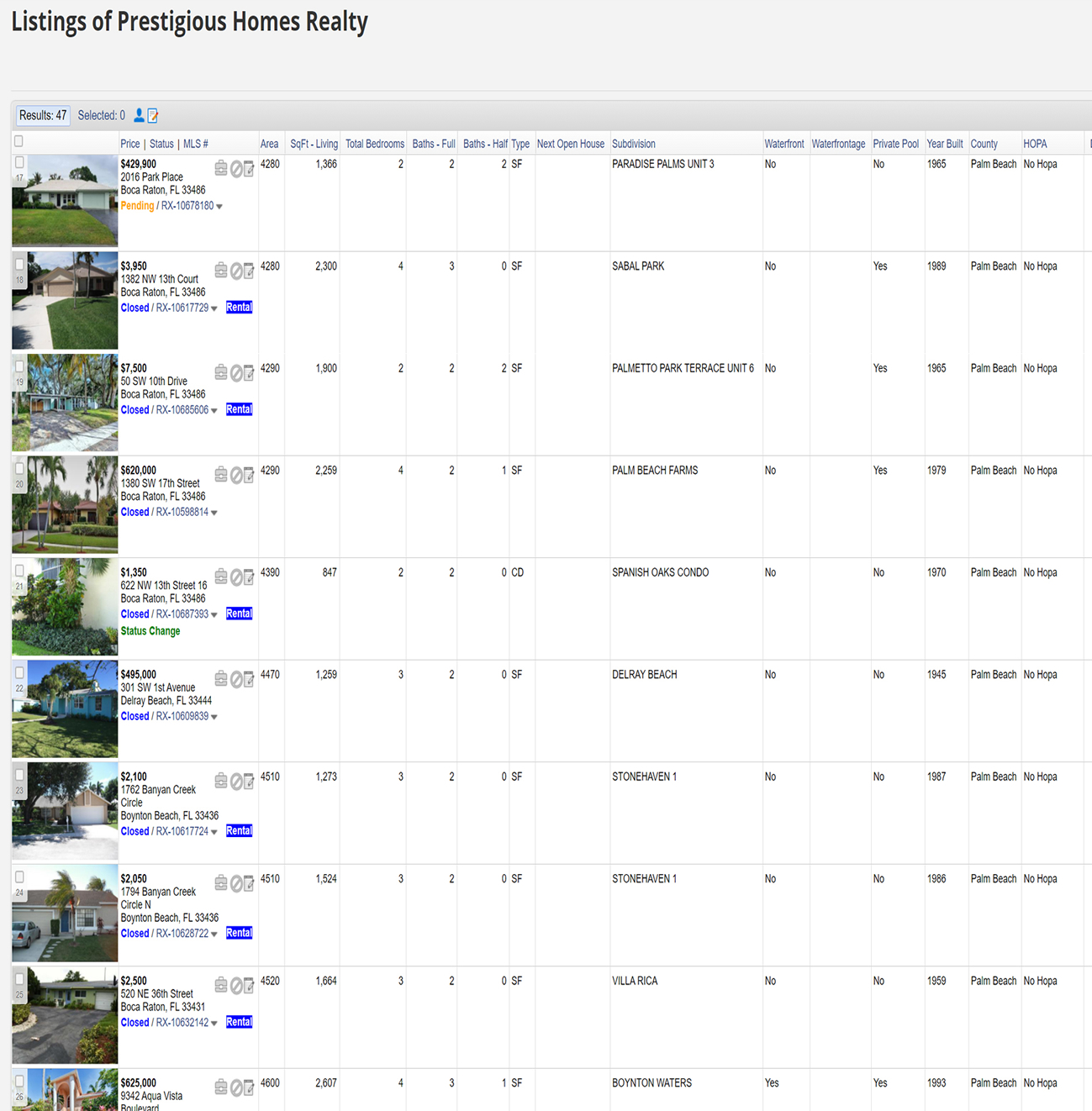 | 15 | RX-10649629 | 463 Newcastle Street | $329,000 | 329,000 | DELRAY MNR | Single Family Detached | 1959 | No | 0 | 2 | 0 | No | 256.23 | ||