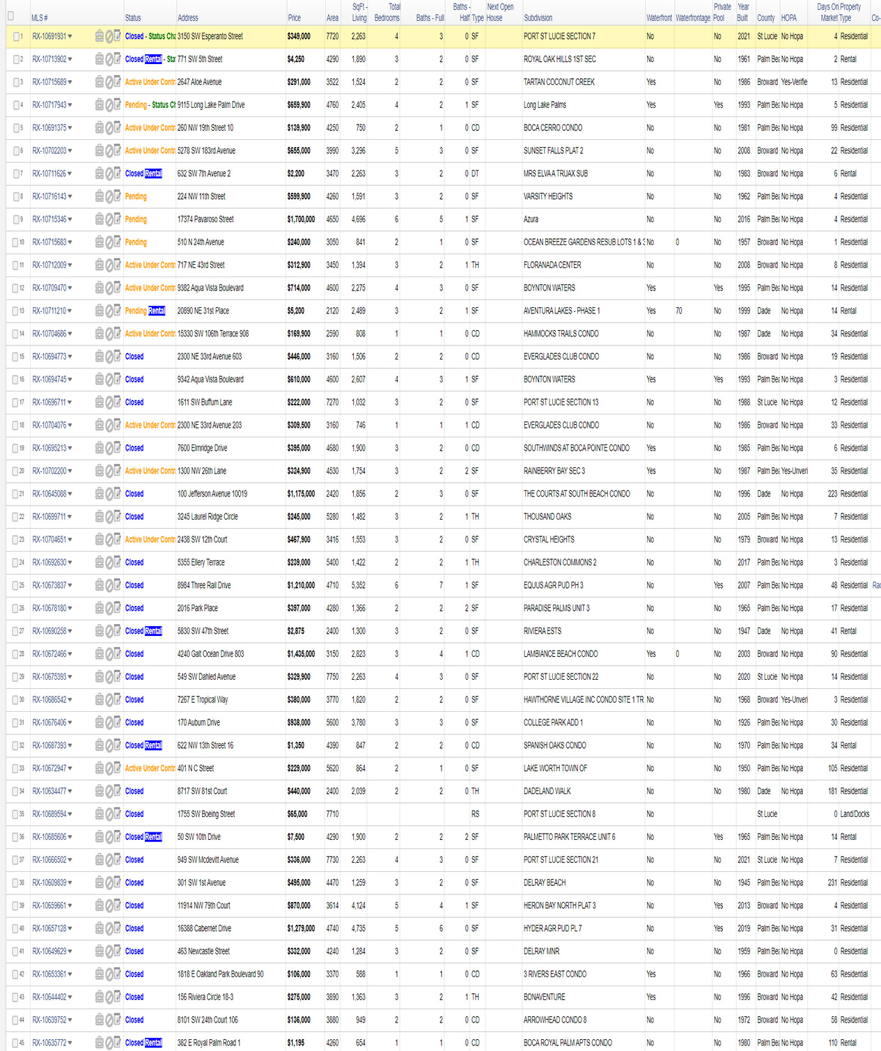 | 35 | RX-10617729 | 1382 NW 13th Court | $4,000 | $3,950 | SABAL PARK | Single Family Detached | 1989 | Yes | 2 | 3 | 0 | No | 1.71 | 1.73 | |