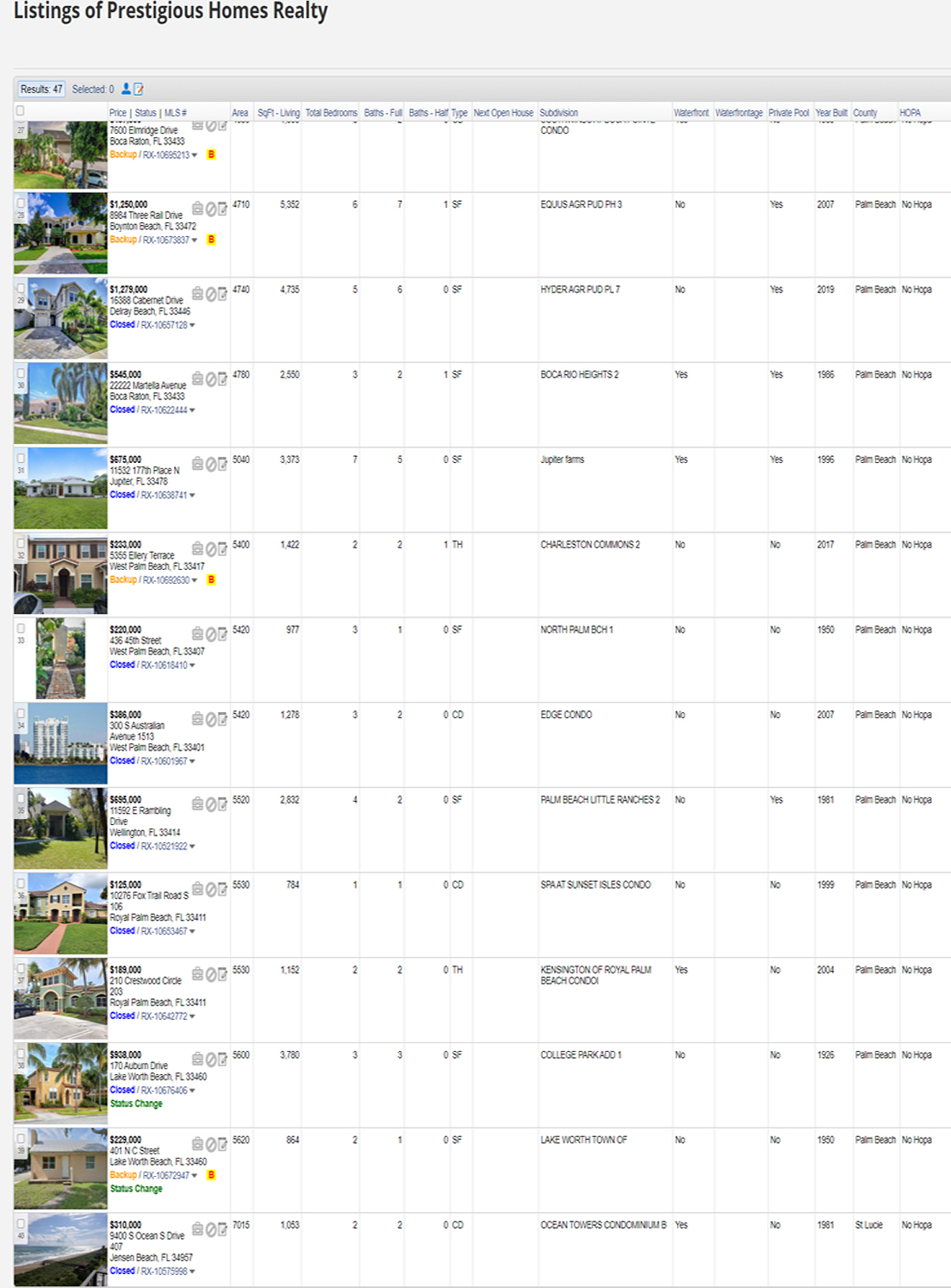 | 46 | RX-10638741 | 11532 177th Place N | $685,000 | $675,000 | Jupiter farms | Single Family Detached | 1996 | Yes | 2 | 5 | 0 | Yes | 200.11 | 203.08 | |